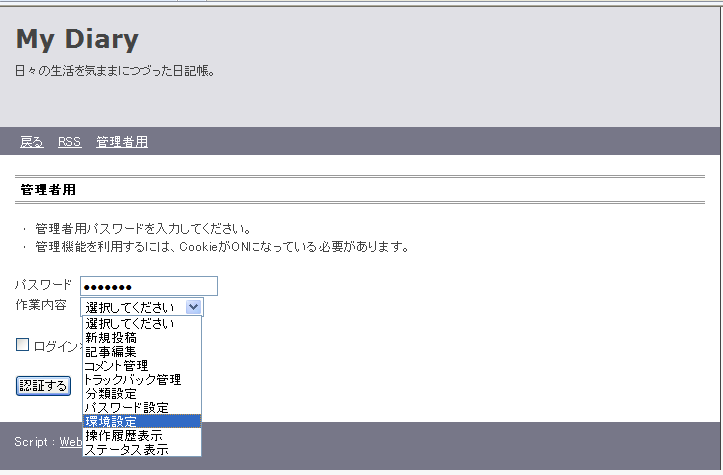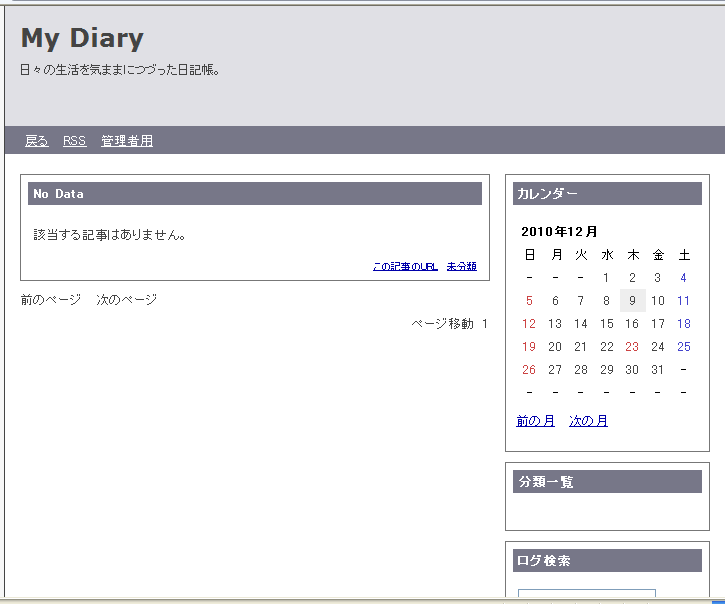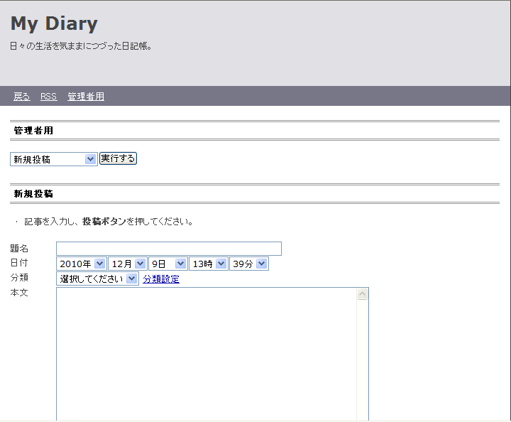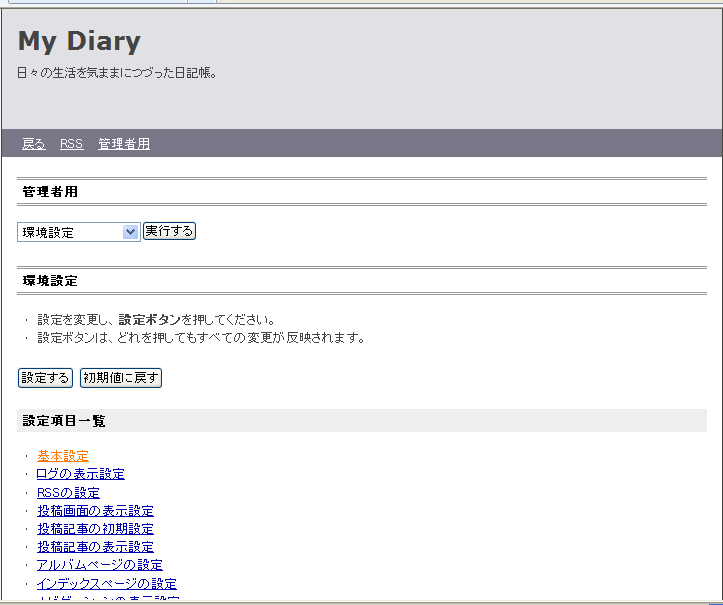 日記のトップ画面が出ますが、まだまだ日記の投稿は出来ません。それなりの環境設定が必要です。