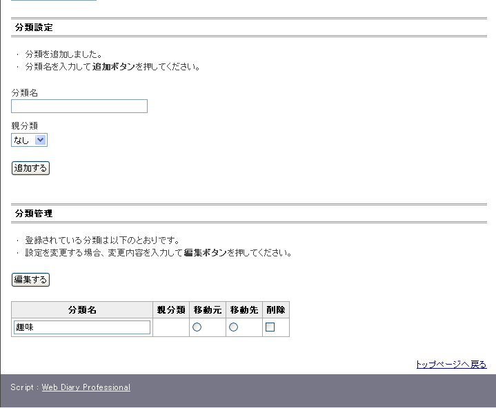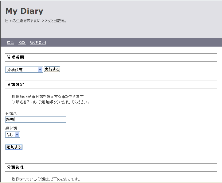 投稿記事の分類を各自の好みで入力します。追加するをクリックすると下に分類名の一覧表が出来ます。